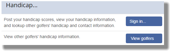 There are a number of reports produced "live" for players for which you as the administrator do not have to lift a finger. These reports are available to your players on your ___.golfclub.net portal website. Your players will see the portal section depicted in the image below when they go to your portal. By clicking on the button labeled "View golfers," they can see their own as well as other golfers' handicap information.
