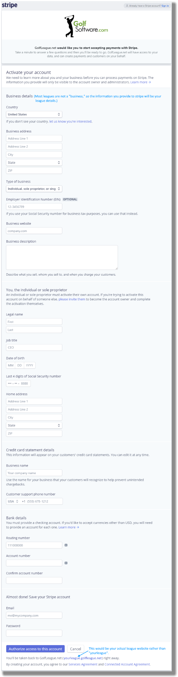 Set up a stripe account to collect league dues
