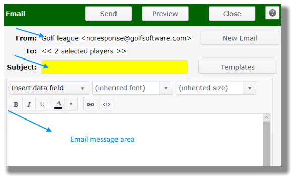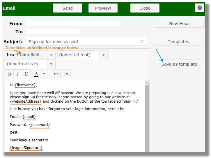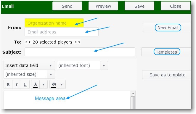 You can use the email function to send one-time emails. You can also create Template emails. After you create an email that you send repeatedly, click on the button labeled "Save as template." Each time you want to send it, open your Templates by clicking on the button labeled "Templates."