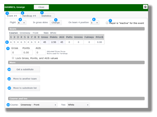 The Player Screen is an important location within League Manager where the administrator may perform a variety of tasks. The numbered list below matches the numbers in the above image.