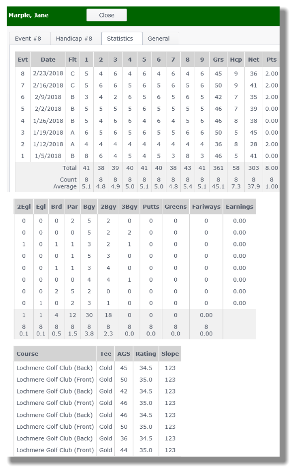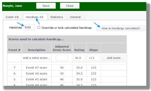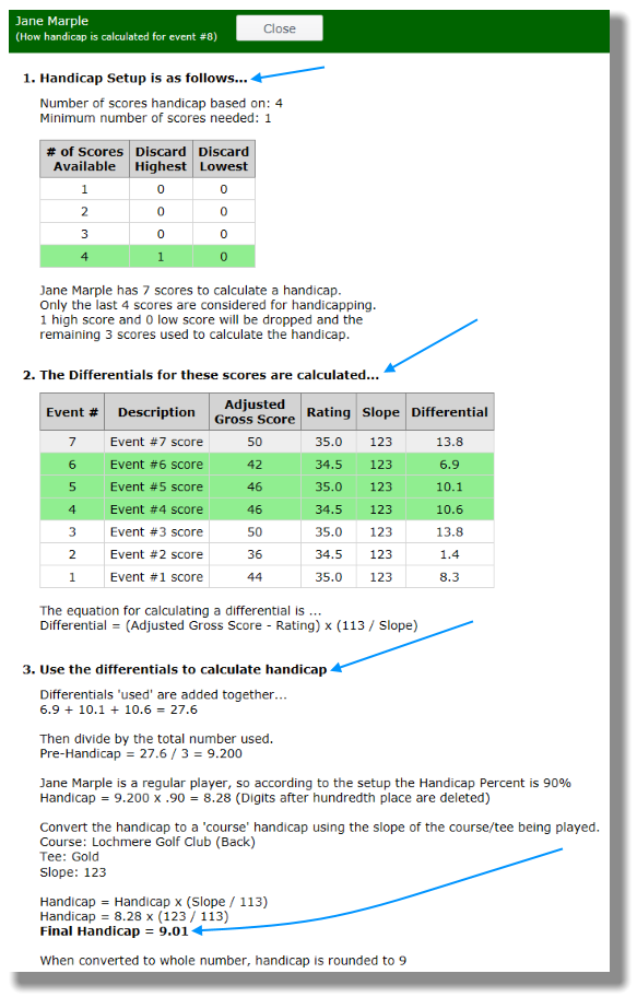 Players may occasionally approach you and ask questions about their handicap. There is a report that shows exactly how a player's handicap is calculated for a specific event. It is very useful for answering any questions they may have about their handicap.