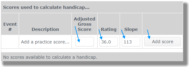 - Start with the oldest score by date and input Adjusted Gross Score, Rating and Slope for the score and then click the Add score button.