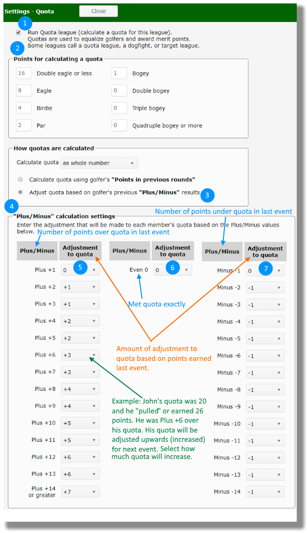 Open the Main Menu, click Settings, click Quota. The following numbered items correspond to the blue numbered bullets in the image. Note that you can use decimal numbers, if it helps you to break ties for an event.