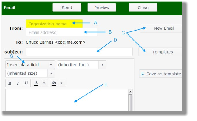 - Enter Organization name (Item A below), Email address (Item B), choose New Email or to use one of previously saved Templates, enter the Subject (Item D), type the message (Item E). Use the Insert data field drop down menu (Item G) to include a player's first and/or last name. If this is an email you might use again or over and over, it is a good idea to Save as template (Item F).